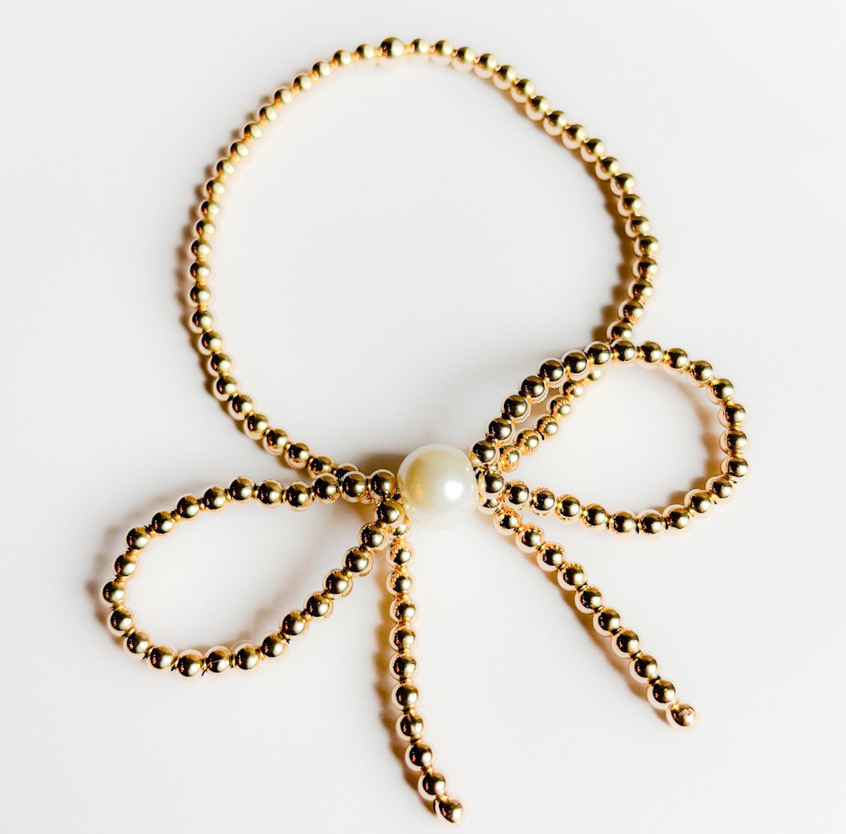 Elevate your outfit with this luxurious gold filled bow bracelet with a pearl-like bead. The delicate bow design adds a touch of elegance, while the stretchy material ensures a comfortable fit. Enhance your style with this sophisticated accessory!